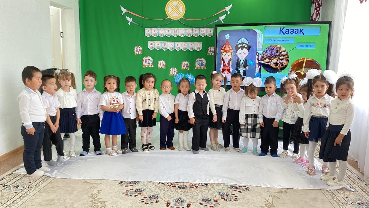 Мақсаты: 1-мамыр Қазақстан халықтарының бірлігі күні екенін балаларға айтып ұғындыру. Балаларды татулыққа, достыққа, елін, жерін сүйе білуге үйрету. Басқа ұлт өкілдерімен таныстырып олармен тату, достық қарым-қатынаста болуға тәрбиелеу.