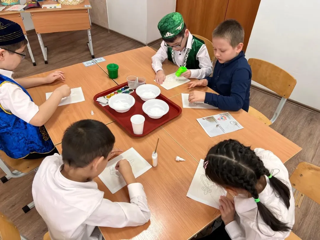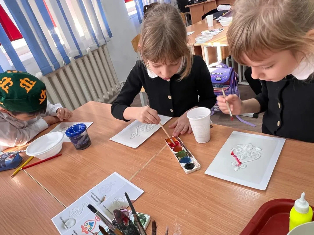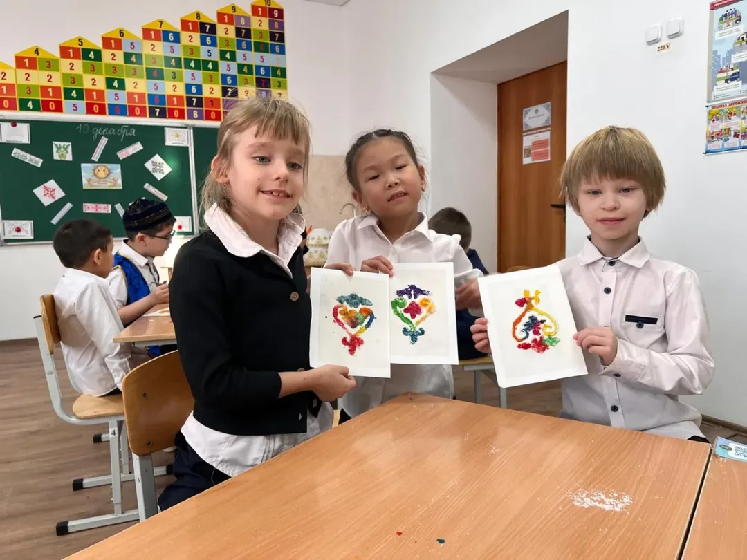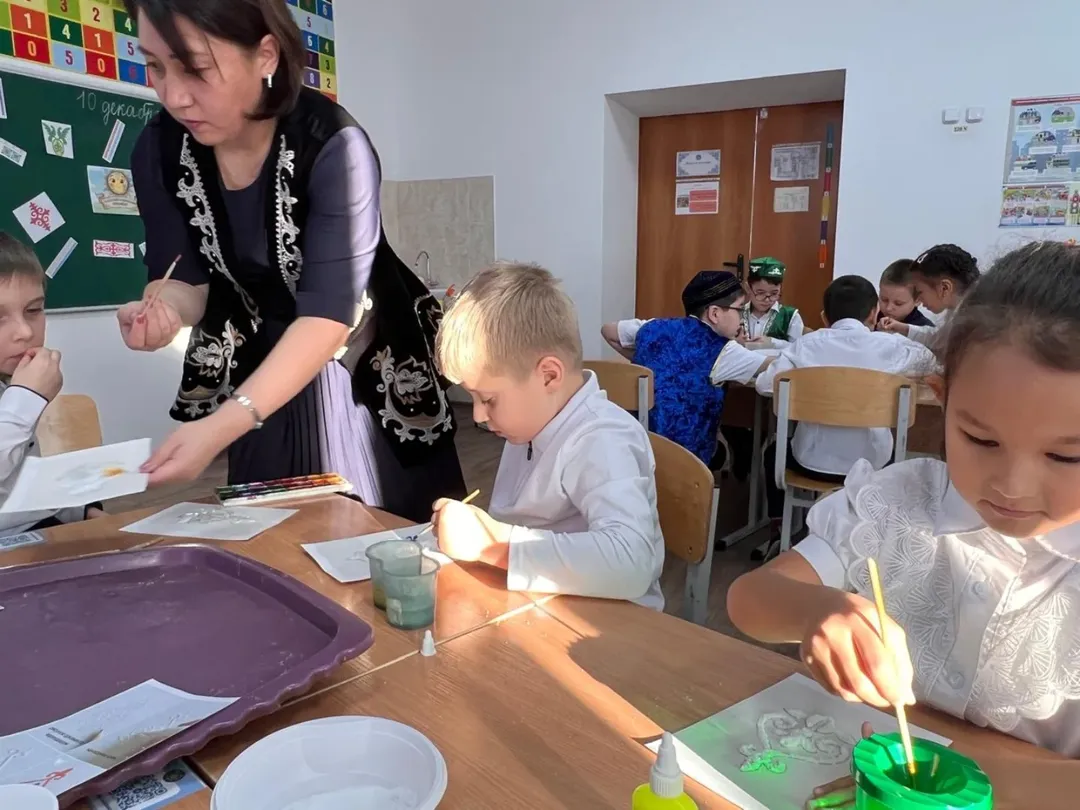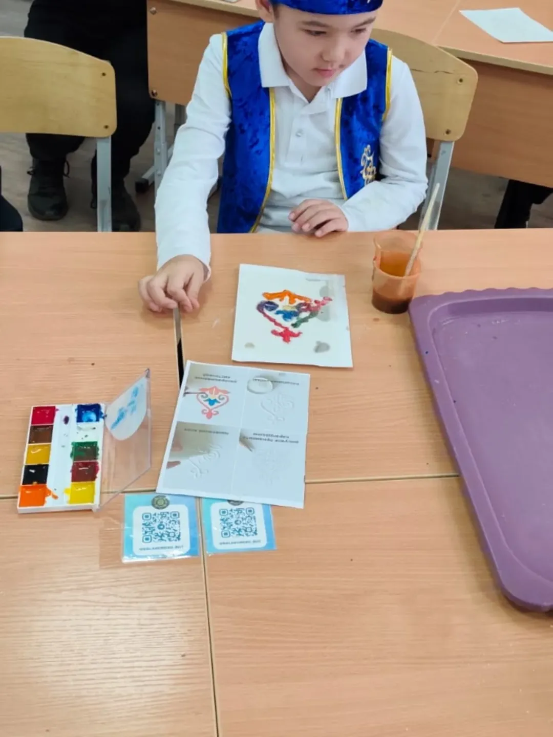 Дети были по-настоящему увлечены необычной техникой выполнения рисунка, которая позволила им создать красочные и фактурные изображения традиционных казахских узоров.